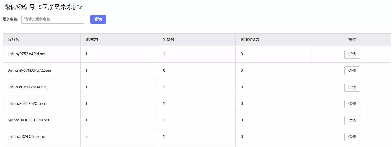 服务列表帮助用户以统一的视图管理其所有的微服务以及服务健康状态。整体界面布局是左上角有服务的搜索框和搜索按钮,页面中央是服务列表的展示。服务列表主要展示服务名、集群数目、实例数目、健康实例数目和详情按钮五个栏目。