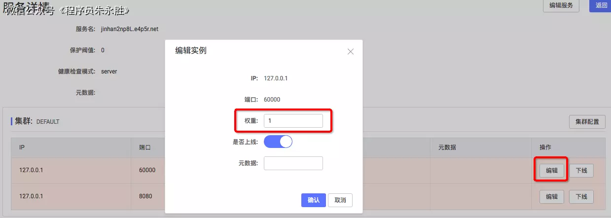 Nacos 为用户提供了流量权重控制的能力,同时开放了服务流量的阈值保护,以帮助用户更好的保护服务服务提供者集群不被意外打垮。如下图所以,可以点击实例的编辑按钮,修改实例的权重。如果想增加实例的流量,可以将权重调大,如果不想实例接收流量,则可以将权重设为0。
