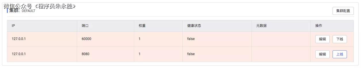 Nacos还提供服务实例的上下线操作,在服务详情页面,可以点击实例的“上线”或者“下线”按钮,被下线的实例,将不会包含在健康的实例列表里。