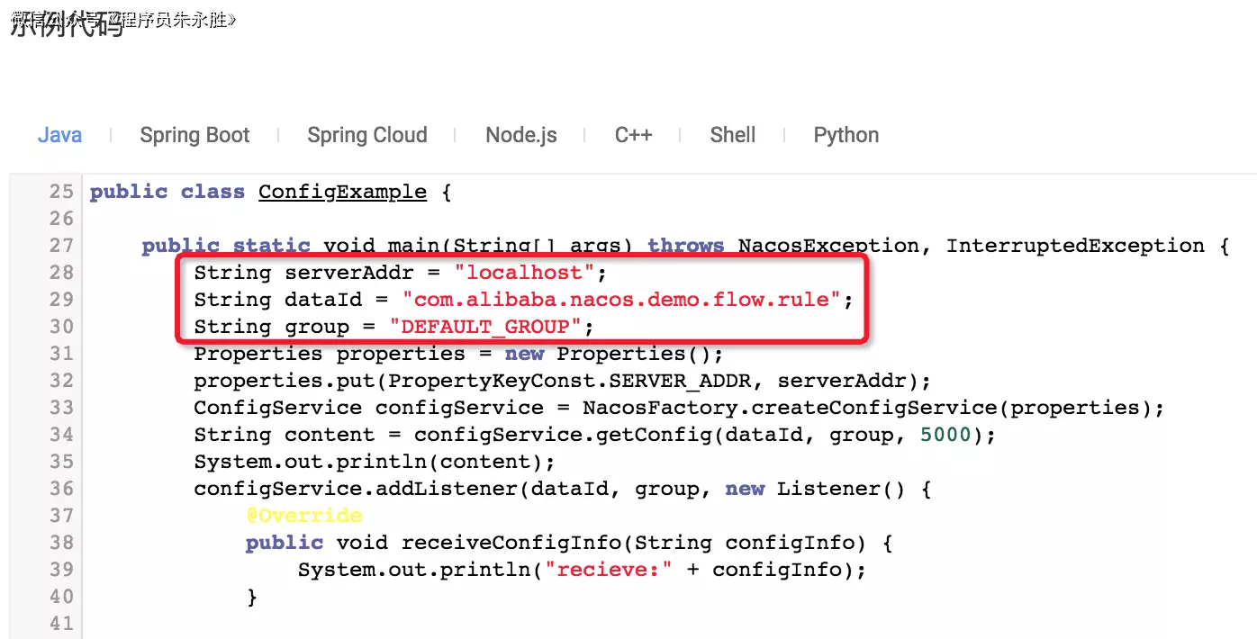 Nacos提供示例代码能力,能够让新手快速使用客户端编程消费该配置,大幅降低新手使用门槛。