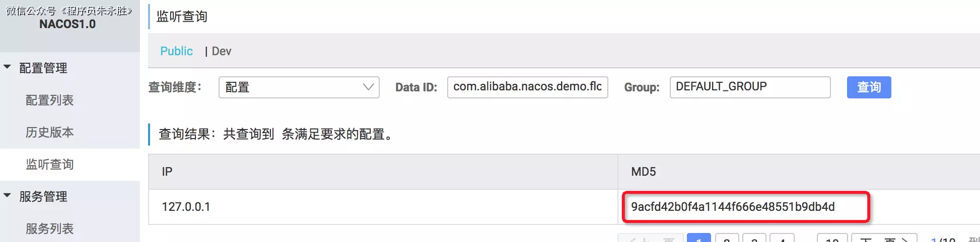 Nacos提供配置订阅者即监听者查询能力,同时提供客户端当前配置的MD5校验值,以便帮助用户更好的检查配置变更是否推送到 Client 端。