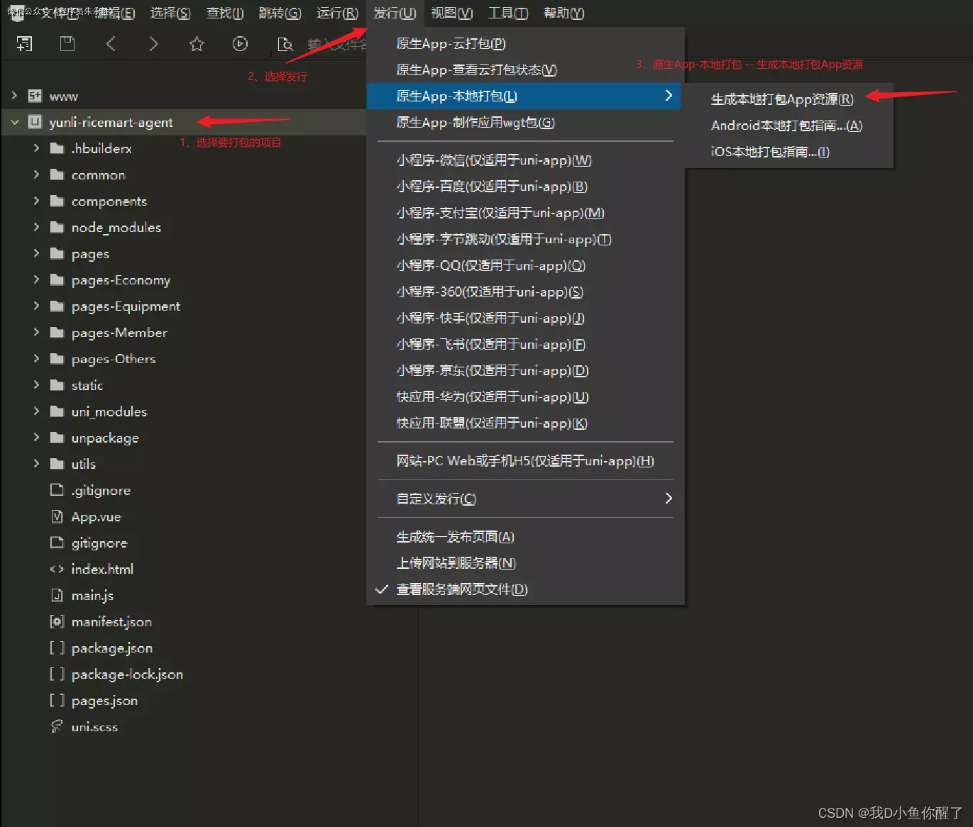 注意:步骤1.2是使用HBuilder X将项目本地打包。细心观察会发现,“本地打包”选项是第三项,第一项为“云打包”