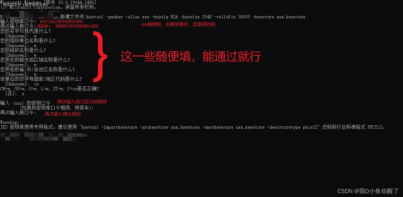 keytool -genkey -alias xxx -keyalg RSA -keysize 2048 -validity 36500 -keystore xxx.keystore