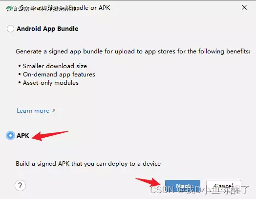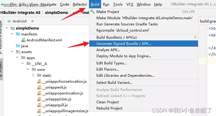 以上步骤完成,可以先在Android Studio上运行一下试试了。这里略过,直接说打包apk文件,步骤见图