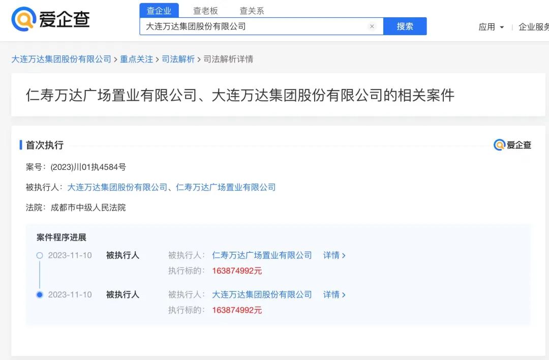 爱企查App显示,近日,大连万达集团股份有限公司及旗下仁寿万达广场置业有限公司新增一则被执行人信息,执行标的1.6亿余元,执行法院为成都市中级人民法院。