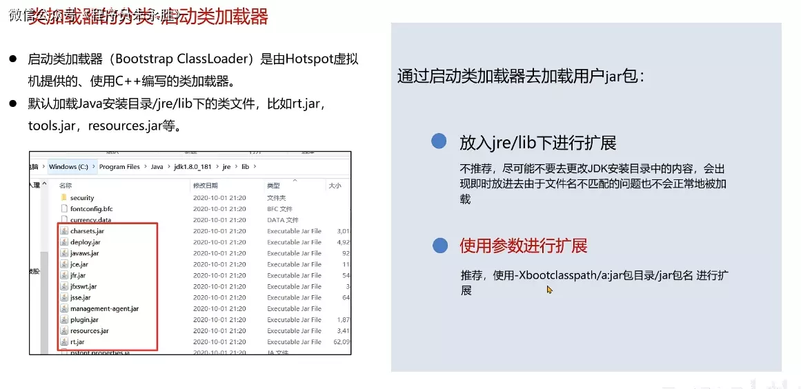 路径下的核心类库或 -Xbootclasspath 参数指定的路径下的jar包加载到内存中⁴。这些核心类库包括rt.jar(runtime)、i18n.jar等,这些是Java的核心类⁴。
