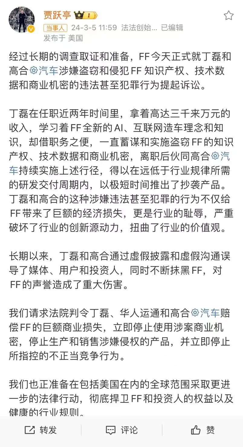 4、贾跃亭对簿丁磊,法拉第未来宣布起诉高合汽车“侵犯商业秘密和不正当竞争”
