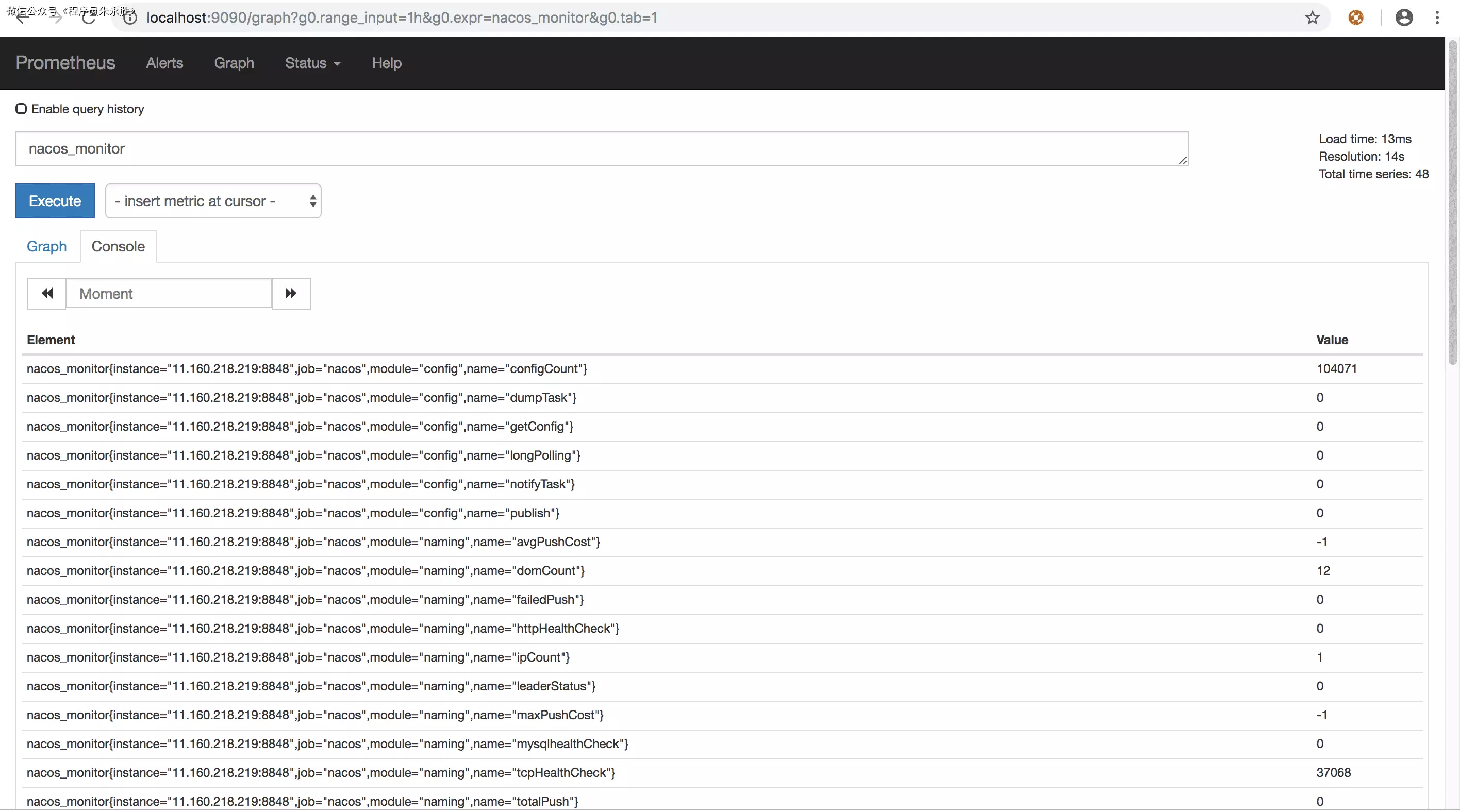 通过访问http://{ip}:9090/graph可以看到prometheus的采集数据,在搜索栏搜索nacos_monitor可以搜索到Nacos数据说明采集数据成功