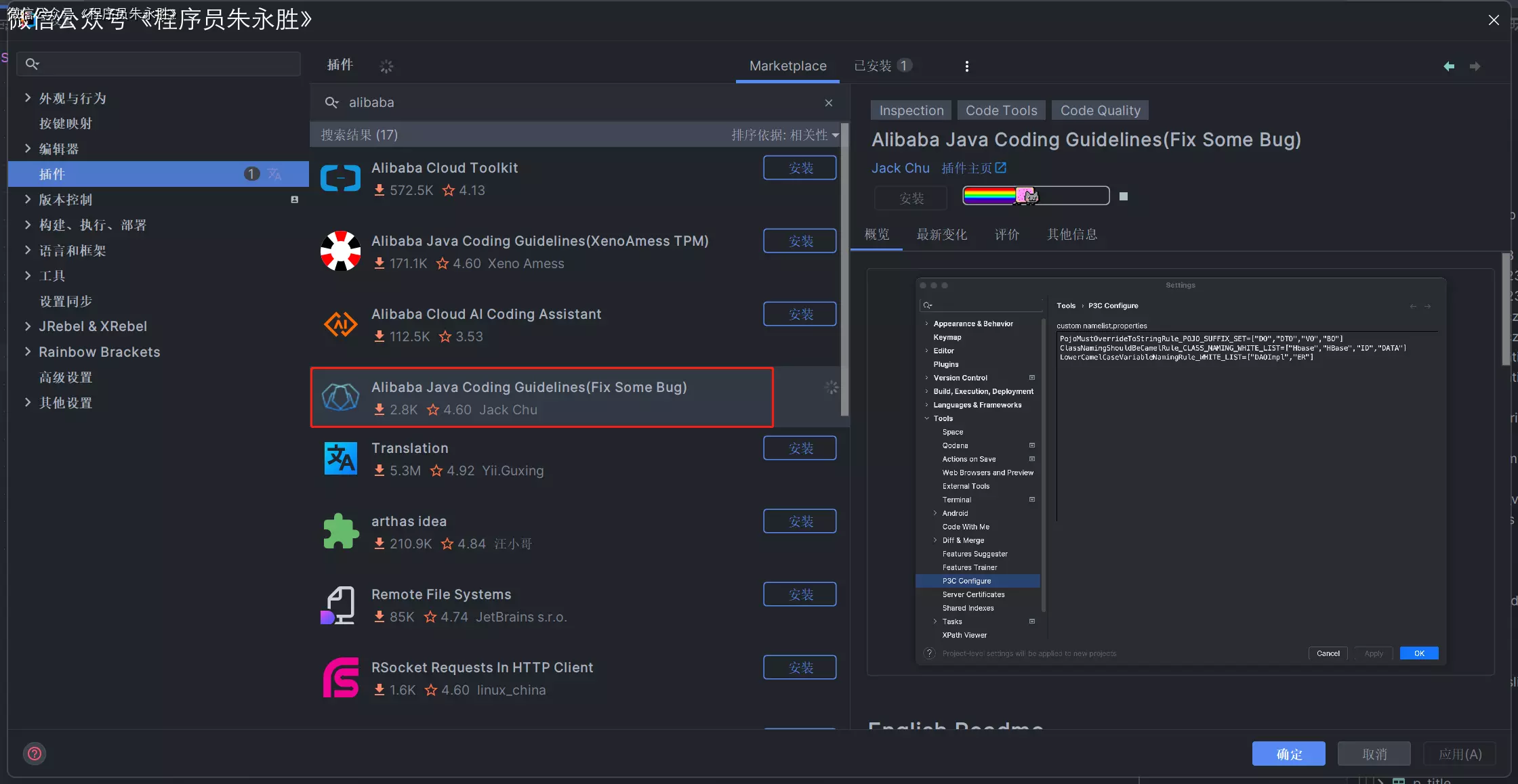 插件官网地址 https://plugins.jetbrains.com/plugin/22381-alibaba-java-coding-guidelines-fix-some-bug-