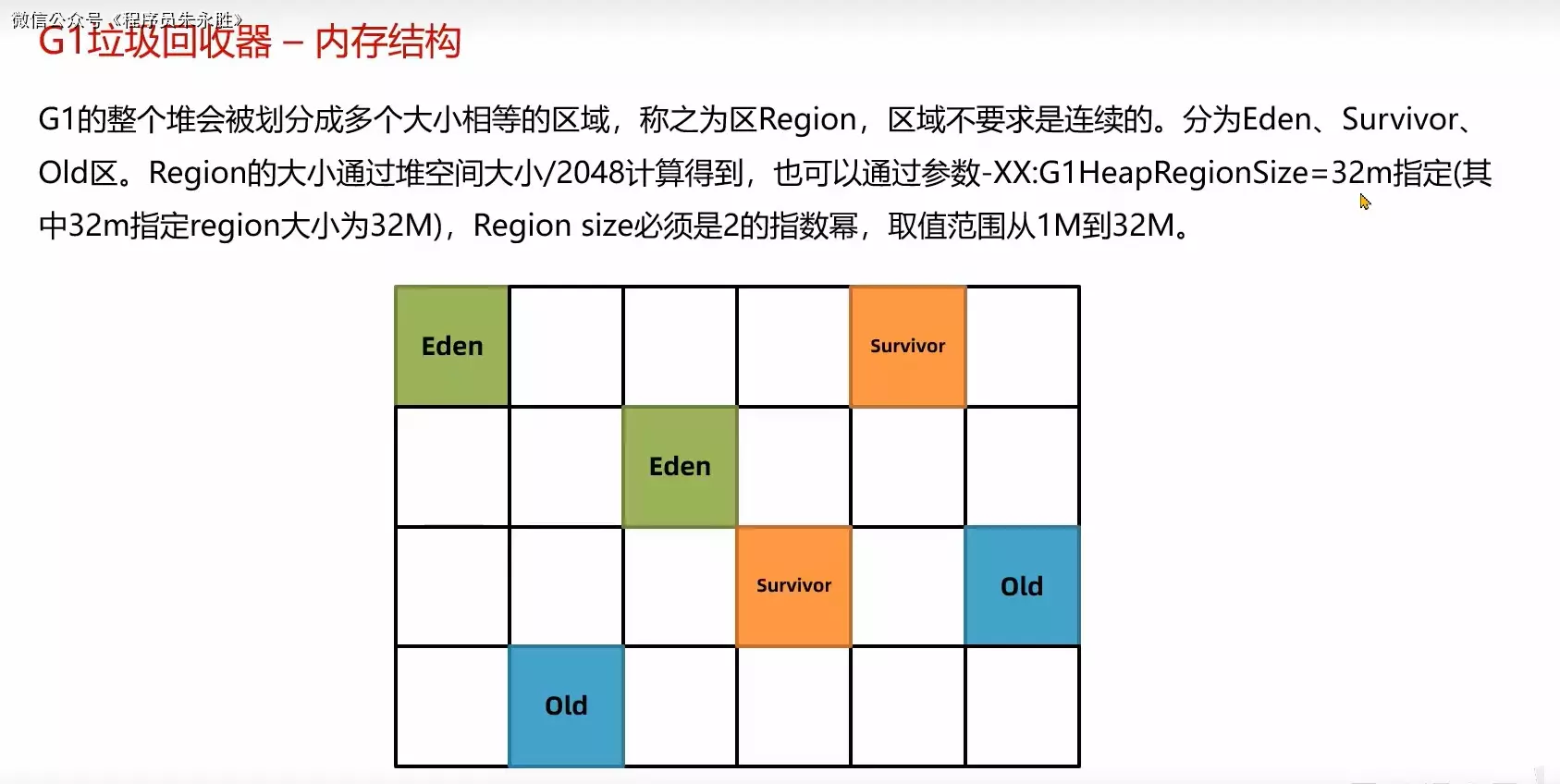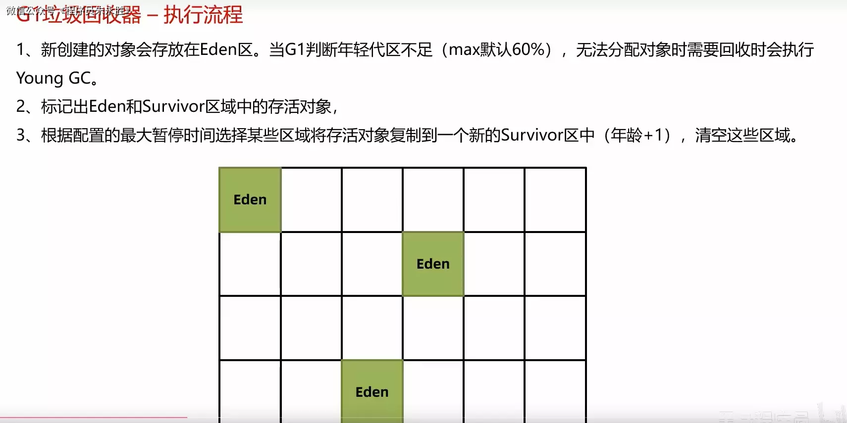 - 区域划分:将堆内存划分为大小相等的区域(Region),每个区域可以是一个Eden区、一个Survivor区或一个Old区。对于可用区域的操作,可以通过多个线程并行处理。
