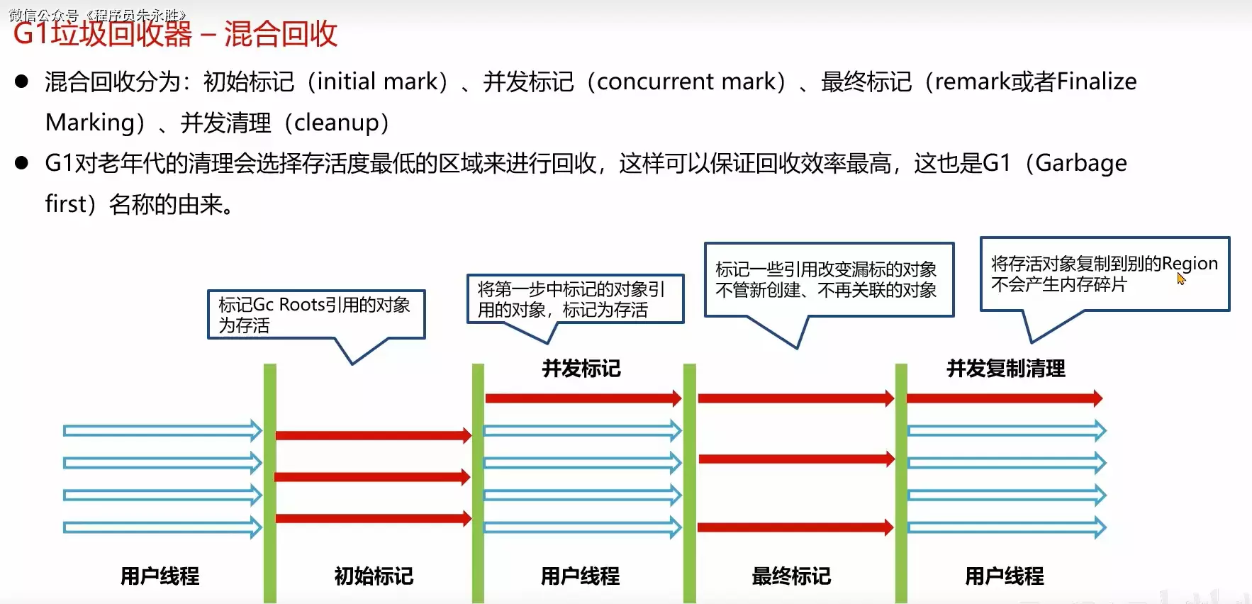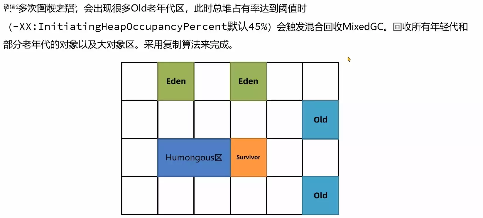 - 并发标记结束和混合阶段:一旦并发标记结束,G1垃圾回收器会开始并发地清理未被引用的对象,并将存活对象复制到空闲区域。这个阶段也称为“并发标记结束和混合阶段”。