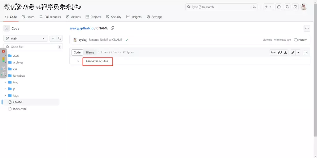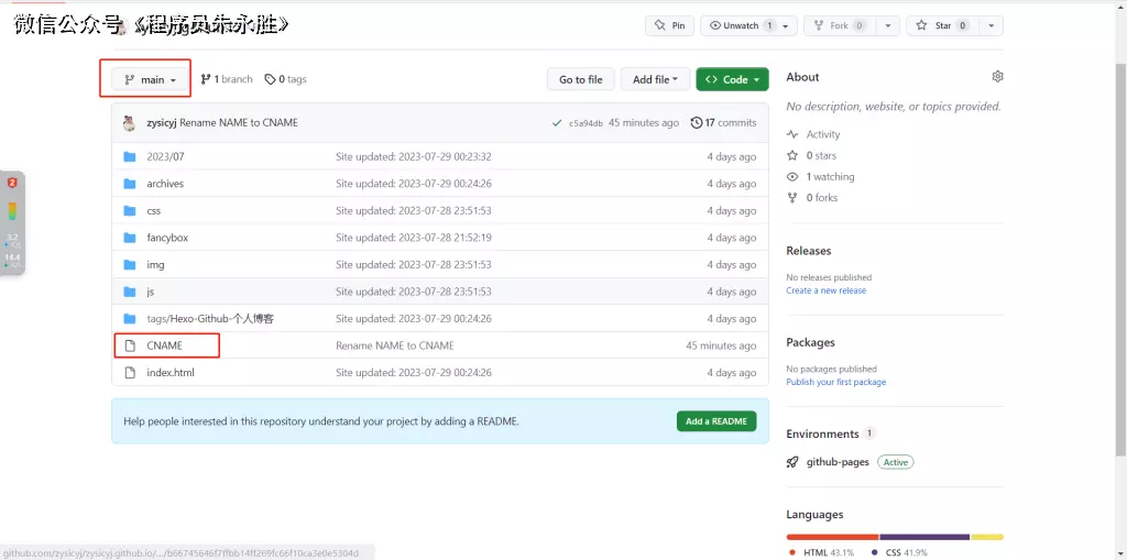 首先找到你的主分支,这个分支要和Setting里面配置的分支一致。然后创建一个NAME文件