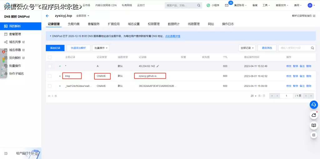 这里需要注意的是,记录值就是你的Github Pages地址,记录类型填写CName,主机记录就是你的二级域名地址