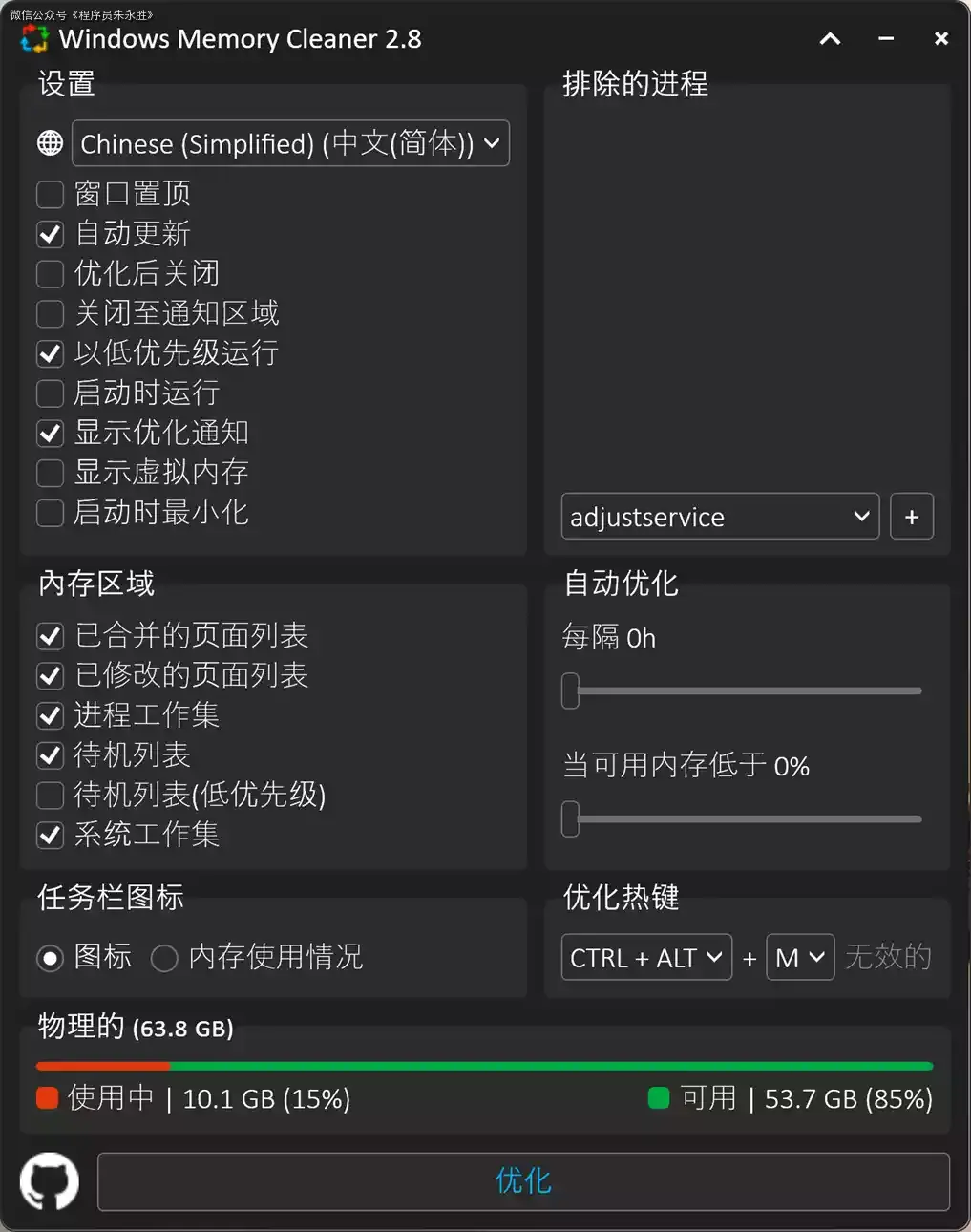 CTRL + ALT + M是默认和可自定义的值Always on top将窗口固定到所有窗口的顶部Auto update使应用程序保持最新状态。它每 24 小时检查一次更新Close after optimization优化后关闭应用程序Close to the notification area单击关闭 (X) 按钮将应用程序最小化到系统托盘Run on low priority它通过降低进程优先级并确保其高效运行来限制应用程序的资源使用。它可能会增加优化时间,但如果您的 Windows 在优化过程中冻结,它会有所帮助Run on startup系统启动后运行该应用程序。它会在 Windows任务计划程序和 Windows 注册表路径SOFTWARE\WOW6432Node\Microsoft\Windows\CurrentVersion\Run 上创建一个条目Show optimization notifications优化后向通知区域发送消息。其中包含释放的大致内存Show virtual memory它还监视虚拟内存的使用情况Start minimized应用程序将最小化到系统托盘。单击图标即可恢复
