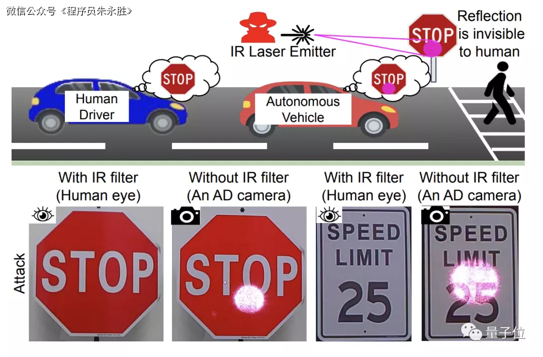 除了篡改二维码,还有用激光照射交通标志从而干扰自动驾驶系统的案例。