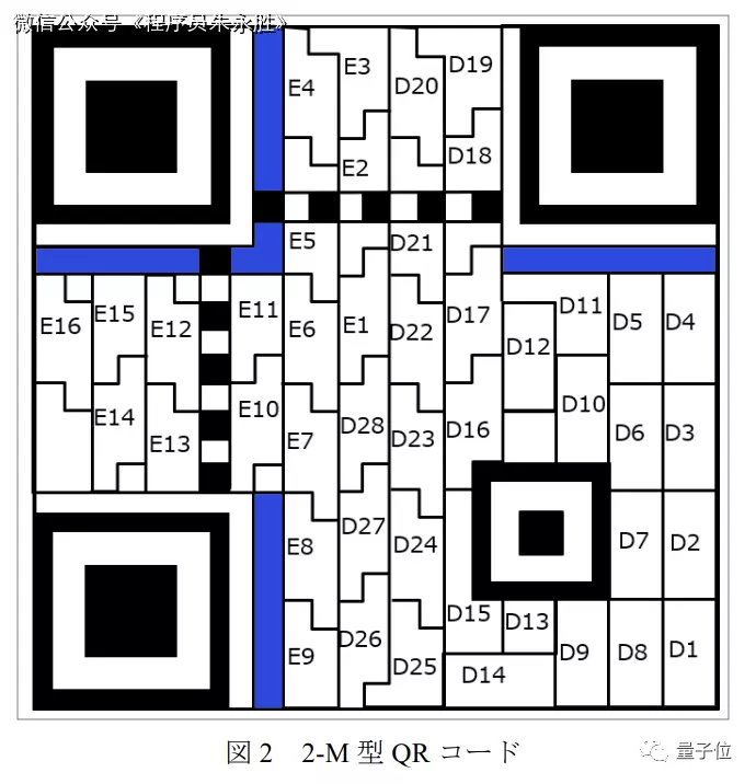 下图中 D1~D28 和 E1~E16 分别为数据字段和纠错字段,蓝色区域则为格式及掩码信息区。