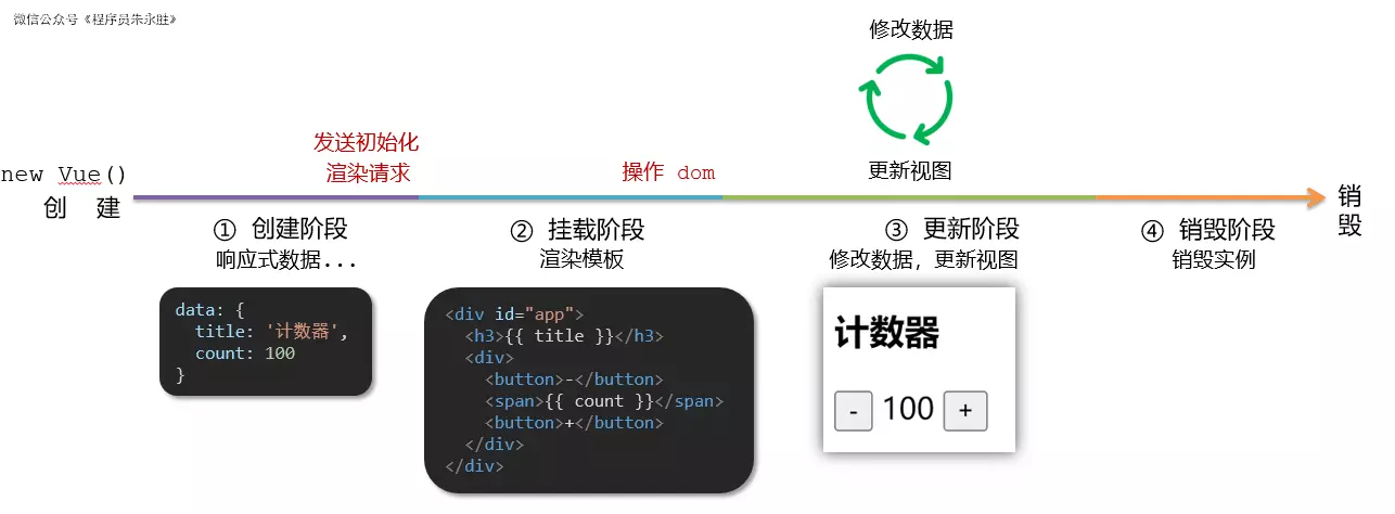 生命周期四个阶段:① 创建 ② 挂载 ③ 更新 ④ 销毁