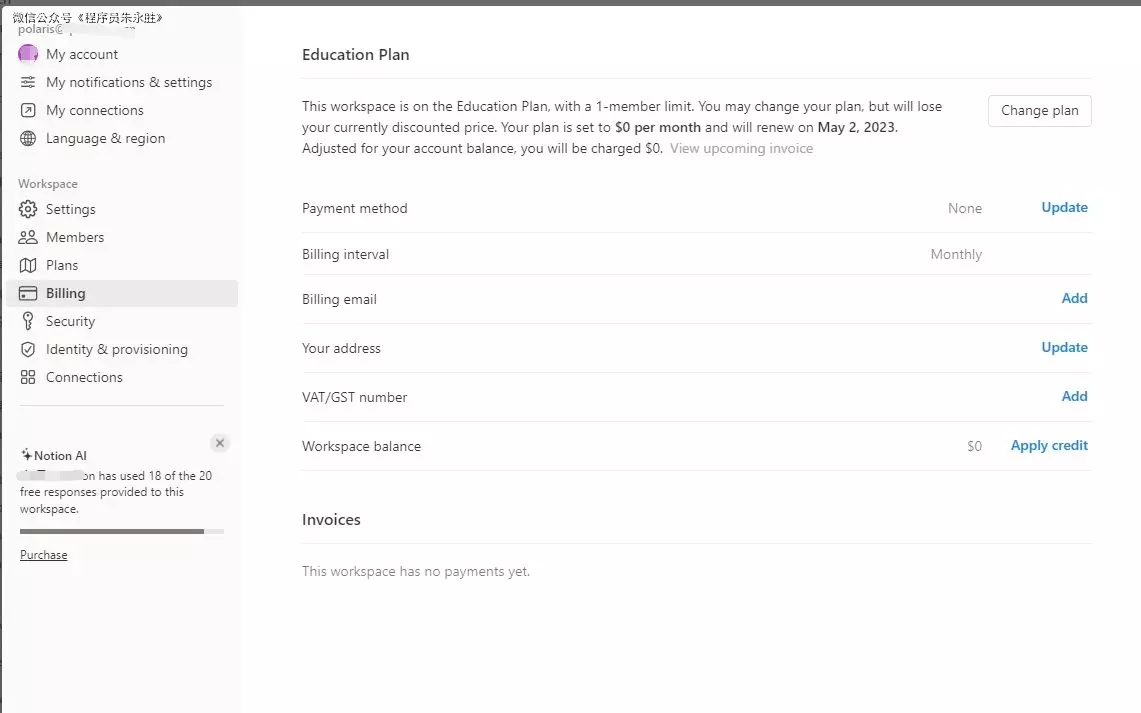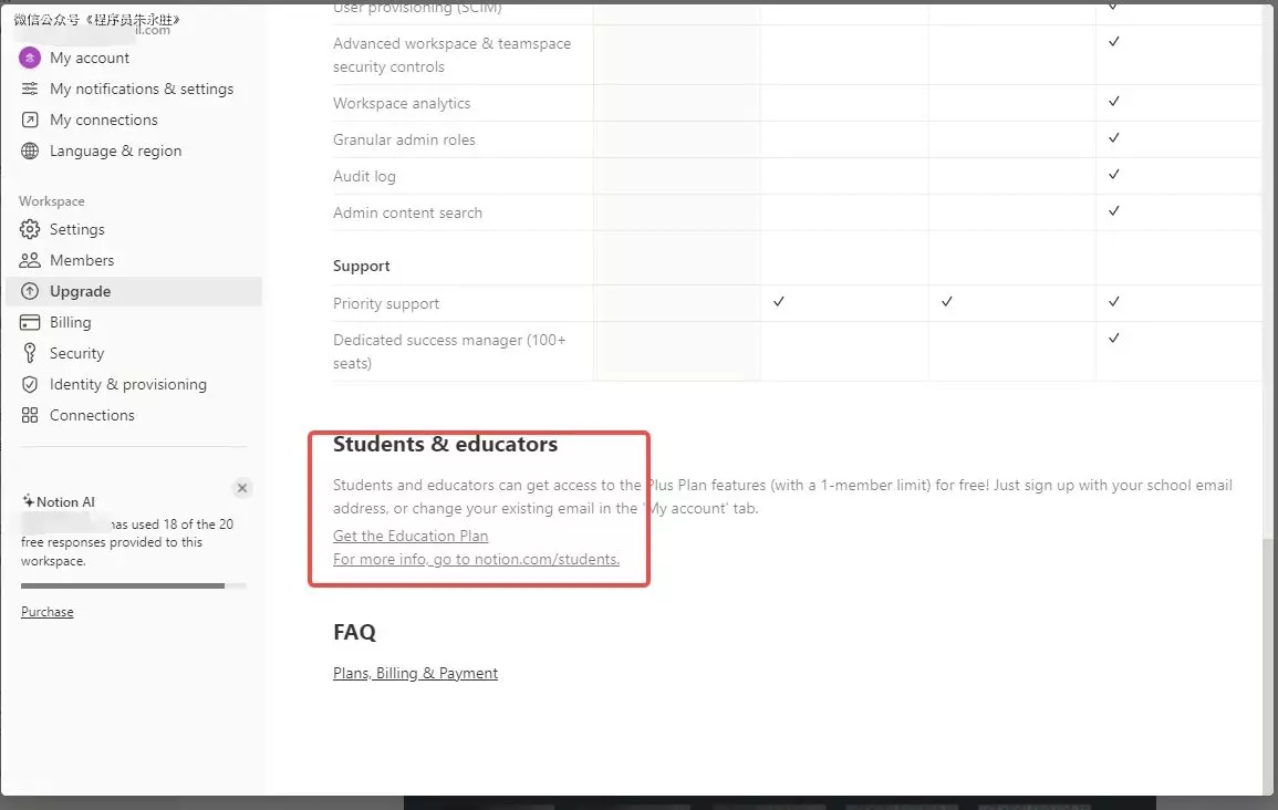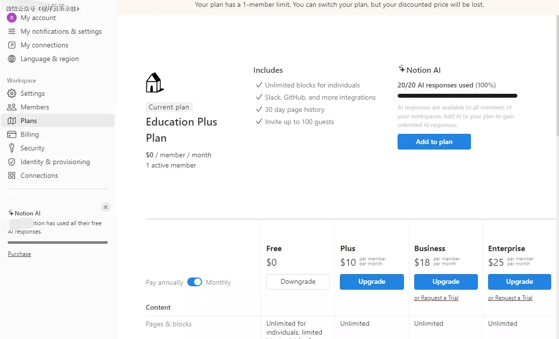 此处仅仅只是获取 Notion Plus ,如果要还要用 **Notion AI** 的话,还是需要花钱的
