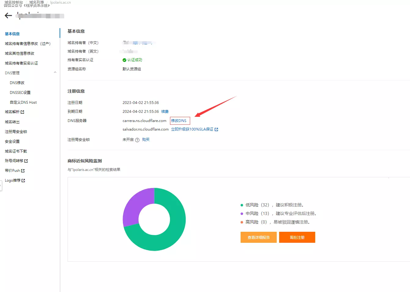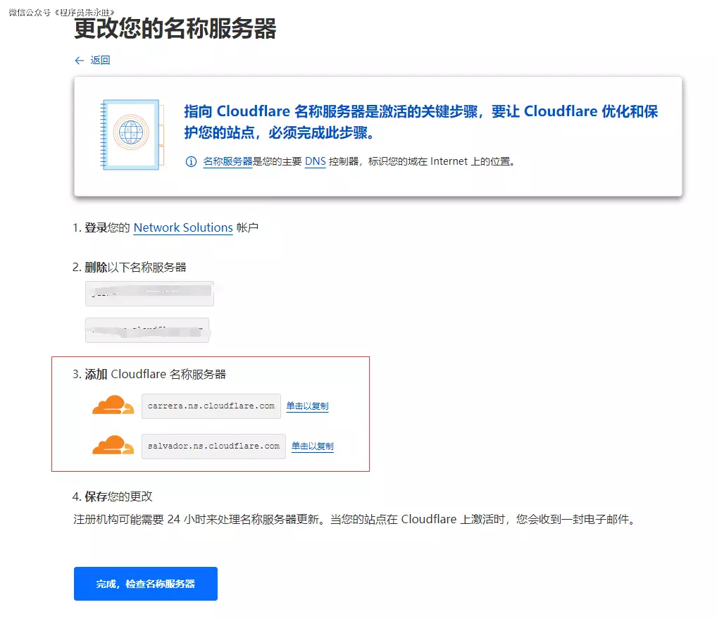一路继续,我们唯一要做的就是,到我们购买的域名平台上将DNS解析更改成 cloudflare,