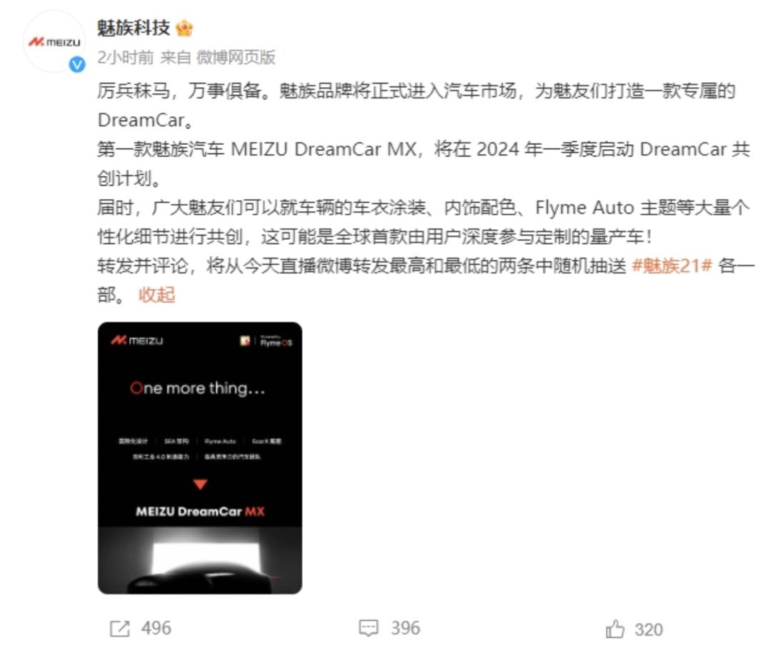 36氪获悉,据魅族科技微博,魅族品牌将正式进入汽车市场。第一款魅族汽车MEIZU DreamCar MX,将在2024年一季度启动DreamCar共创计划。